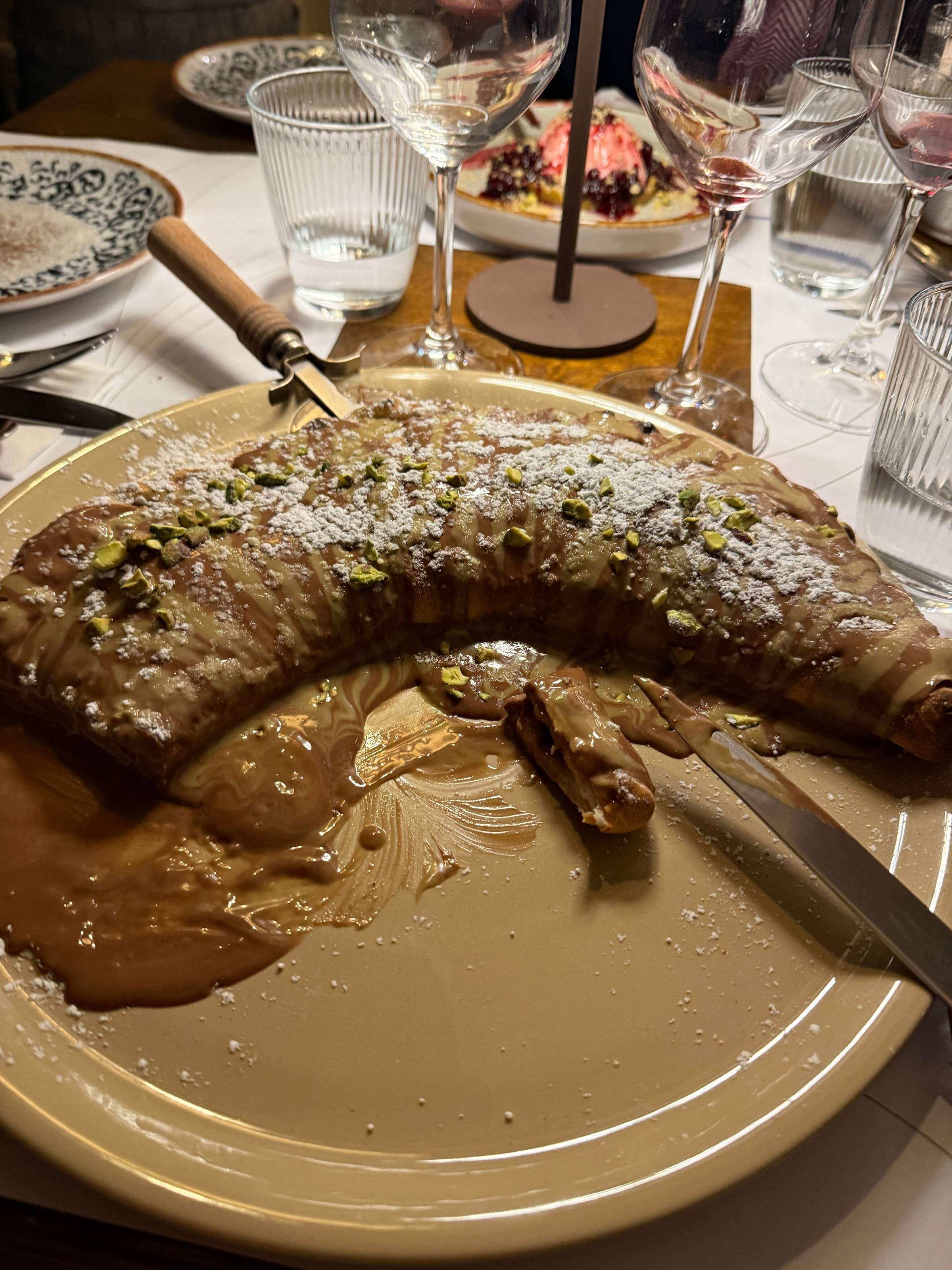 Oh, and before I go. Check out the dessert I ordered last night. A chocolate-filled, pistachio-covered calzone. I thought it was going to be a regular-sized dessert, but it was a full-on main course! The waiter laughed when he brought it out and noticed it was just for me. The 3 of them were sharing a dessert by the way and did help me a little with mine ๐ In my defence, I did do 28k steps yesterday #balance